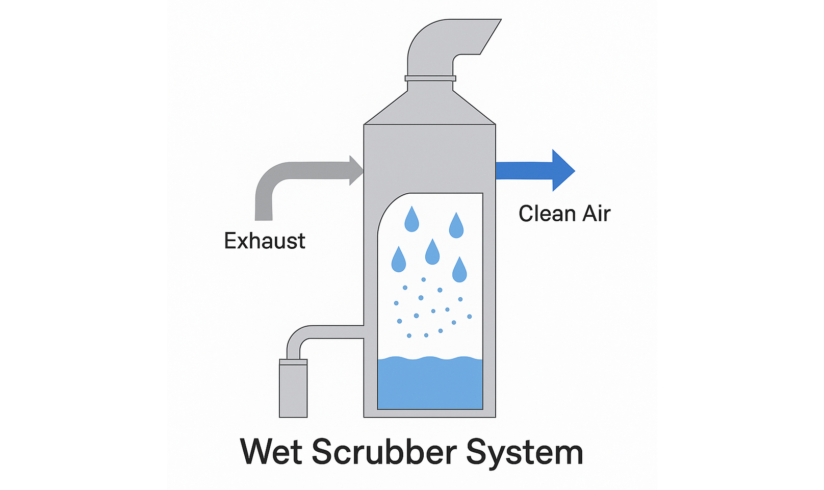 A wet scrubber is an air pollution control system that uses water or liquid chemicals to capture airborne particles, paint mist, and chemical vapors (VOCs). It works by drawing contaminated air through a water curtain or spray chamber, where pollutants are absorbed and filtered out before clean air is released back into the factory or environment.