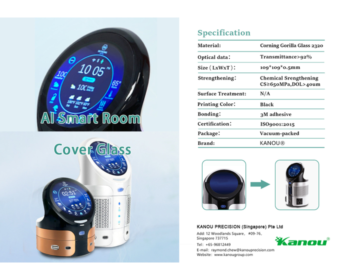 - Optimized for AI-powered smart control panels in smart homes and appliances - Premium black printing for an elegant, professional appearance - ISO 9001:2015-certified for consistent, trusted quality - Vacuum-sealed packaging for safe delivery 🔹 Specifications - Material: Corning Gorilla Glass 2320 - Optical Transmittance: T > 92% - Dimensions: 109 × 109 × 0.5 mm - Surface Strength: CS > 650 MPa, DOL > 40 μm - Strengthening Method: Chemical strengthening - Printing Color: Black - Mounting Method: 3M double-sided adhesive - Certification: ISO 9001:2015 - Packaging: Vacuum-sealed 🔹 Applications - Smart appliance control panels - IoT-enabled home devices - Premium interior electronics Manufactured in China, with localized support and seamless coordination available through KANOU PRECISION VIET NAM’s representative office in Vietnam. 📩 For more information, please download the product PDF or contact us directly for tailored support.