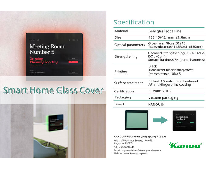 KANOU PRECISION VIET NAM offers high-performance cover glass solutions tailored for control panels used in smart homes and smart offices. Designed to enhance both functionality and aesthetics, this product is ideal for wall-mounted displays, meeting room schedulers. With a size of 183 × 156 × 2.1 mm (9.5 inches), the glass is made from gray soda lime material and chemically strengthened (CS > 400 MPa, DOL > 8 µm) to ensure long-lasting durability. Its anti-glare (AG) etched surface and anti-fingerprint (AF) coating maintain a clear display and smooth touch performance even under indoor lighting conditions. The bezel features a semi-transparent black print that delivers a high-end appearance while blending seamlessly with modern interiors. Manufactured under an ISO 9001:2015-certified quality system and vacuum-packed for safe delivery, this product ensures reliability in both performance and logistics. 🔹 Key Features +Optimized for smart homes and smart office control panels - AG/AF surface treatment minimizes reflection and fingerprints - Semi-transparent black bezel print adds a premium look - Chemically strengthened for impact resistance and durability - Backed by ISO 9001:2015 certification and vacuum-sealed packaging 🔹 Specifications - Material: Gray soda lime glass - Size: 183 × 156 × 2.1 mm (9.5 inches) - Optical Data: Gloss: 50 ±10, Transmittance: 41.5% ±3 (550 nm) - Strengthening Method: Chemical strengthening Surface Strength CS > 400 MPa, DOL > 8 μm Surface Hardness 7H (pencil hardness) - Printing: Black bezel, semi-transparent (10% ±5 transmittance) - Surface Treatments AG (etched anti-glare), AF (anti-fingerprint) - Certification ISO 9001:2015 - Packaging Vacuum-sealed With production support from our Vietnam-based office, we ensure smooth business negotiations and after-sales service. 📩 For product integration into your smart solutions, please feel free to contact us or download the detailed brochure.