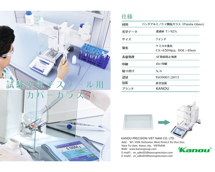 KANOU PRECISION provides specially designed cover glass for laboratory weighing scale, serving research institutions, medical facilities, and industrial applications. Our cover glass combines exceptional durability, superior light transmittance, and anti-fingerprint coating to ensure precise operation and long-term stable performance. [Technical Specifications] Custom cover glass for touch/display modules: - Size: 1–21 inches (customizable to design requirements) - Material: Panda glass (aluminosilicate glass) - Optical Performance: Transmittance>92%, providing excellent display clarity - Strengthening: Chemical strengthening (CS > 650 MPa, DOL > 40 μm) - Surface Treatment: Anti-fingerprint (AF) coating - Printing Color: White - Surface Bonding: Not applied (supplied as individual, unbonded unit) - Certification: ISO 9001:2015 compliant - Packaging: Specialized protective packaging [KANOU PRECISION's Strengths in Cover Glass Processing] - Laser processing with automatic positioning system, achieving ultra-fine precision down to 0.1mm diameter - Fast delivery: Minimum processing time of 15 days - High production capacity: Up to 350,000 pieces per month - 100% product inspection under cleanroom conditions - International certifications: ISO 9001 and ISO 13485 If your company is looking for high-quality touch cover glass for laboratory electronic weighing scales, please contact KANOU PRECISION. We offer comprehensive solutions from design, processing, and inspection to delivery, ensuring precise and flexible response to all technical requirements. With our business office in Vietnam, KANOU PRECISION also provides prompt and direct support to customers across Southeast Asia.