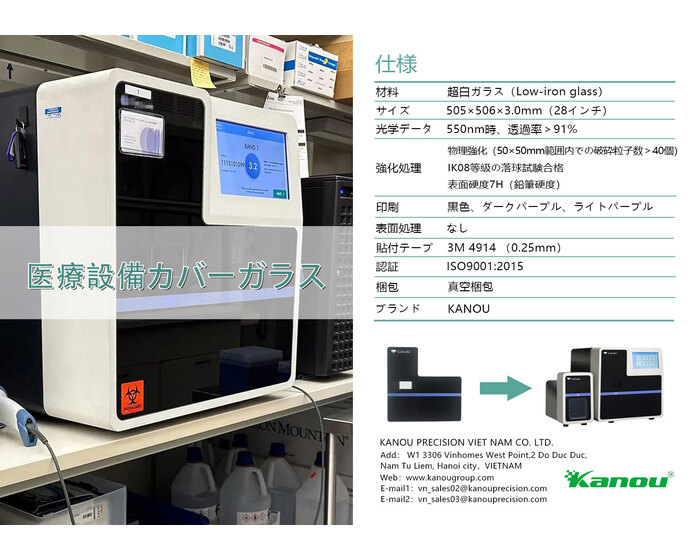 Cover Glass for Medical Devices – 28-inch, Compatible with Control Panels, Ultra-White Glass KANOU’s cover glass is designed for medical device control and operation panels, combining high light transmittance, impact resistance, and strict quality standards. ■ Overview This product is a cover glass for medical equipment manufactured by KANOU, specifically intended for use in control panels and interactive displays. It adopts ultra-white (low-iron) glass, achieving over 91% light transmittance at 550nm. Designed to fit a 28-inch size (505 × 506 × 3.0mm), it provides both visibility and durability for medical environments. ■ Features - Light transmittance >91% at 550nm: ensures high visibility - Passed IK08 drop ball test: excellent impact resistance - Surface hardness 7H (pencil hardness): scratch-resistant design - Physically strengthened (more than 40 fracture particles within a 50×50mm area) - Printable colors: black, dark purple, light purple - Vacuum packaging to maintain quality during transport - ISO9001:2015 certified - Uses 3M 4914 adhesive tape (0.25mm thick) for stable attachment to displays Advantages: - Outstanding visibility: High transmittance for clear screen display - High impact resistance: Meets IK08 standard to reduce breakage risk from drops - Scratch-resistant: 7H surface hardness for reliable daily use - Stable strength: Physical strengthening minimizes scattering even if breakage occurs - Color variety: Supports black, dark purple, and light purple printing - Safe transport & installation: Vacuum packaging and high-quality adhesive ensure product integrity and stable application - Quality assured: ISO9001:2015 certification guarantees reliability ■ Specifications - Material: Ultra-white (low-iron) glass - Size: 505 × 506 × 3.0mm (28-inch) - Optical transmittance: ≥91% (at 550nm) - Surface treatment: None - Printing colors: Black / Dark Purple / Light Purple - Surface hardness: 7H (pencil hardness) - Strengthening: Physical strengthening (more than 40 fracture particles within 50×50mm area) - Impact test: Complies with IK08 standard - Adhesive tape: 3M 4914 (0.25mm thickness) - Packaging: Vacuum pack - Certification: ISO9001:2015 ■ Applications - Cover glass for medical operation panels - Protective glass for medical device control panels With its combination of high transmittance, impact resistance, and versatile design adaptability, KANOU’s cover glass is the ideal choice for medical equipment adopting interactive displays. For more details, please download the PDF or feel free to contact us.