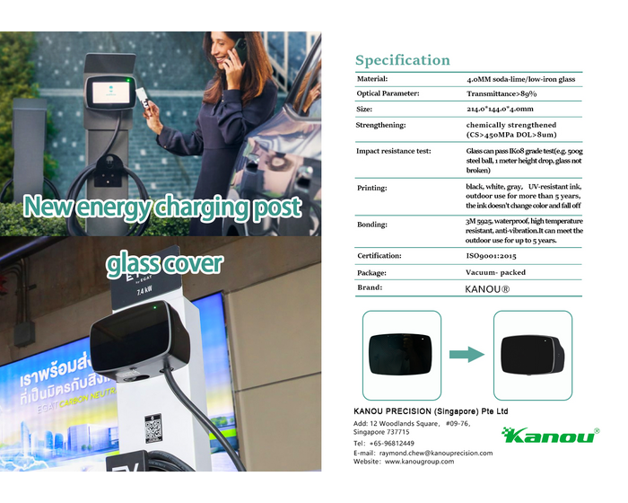 Touch Glass for EV Charging Stations | High Durability, High Transparency, Outdoor-Ready Solution by KANOU High-Quality Touch Glass for the Clean Energy and EV Era With the rise of clean energy and electric vehicles, EV charging stations are being widely deployed across industrial zones, urban areas, parking lots, and commercial centers. One of the most crucial components determining both user experience and the station’s durability is the touch glass – the display surface that allows direct interaction with the control system. Key Requirements for Touch Glass in EV Charging Stations Cover glass used in outdoor environments must meet the following performance criteria: High light transmittance to ensure clear visibility even under direct sunlight Impact and scratch resistance to guarantee safety in public environments Weather resistance to withstand harsh conditions such as heat, rain, wind, and UV exposure Long-term stability, resistant to yellowing, fading, or peeling of printed layers after prolonged outdoor exposure. ⚙️ Features of KANOU Cover Glass – Designed for High-Standard EV Charging Stations KANOU’s touch glass products are specially engineered for EV chargers, meeting rigorous standards for durability, optical performance, and safety: Material: Soda-lime glass or ultra-clear glass, 4.0 mm thick, ensuring high transparency and robust surface strength. Transmittance: T > 89% for bright, vivid display visibility under all lighting conditions. Strengthening: Chemically strengthened glass with surface compression CS > 450 MPa, DOL > 8 µm, compliant with IK08 impact standard. Printing: Black / White / Gray UV resistance up to 1250 hours, with no fading or peeling Adhesion: 3M 5925 double-sided tape Superior waterproofing, heat resistance, and vibration resistance - ideal for outdoor use Quality Control: ISO 9001:2015 certified, with strict management from raw materials to packaging Packaging: Vacuum-sealed to prevent damage during transportation and storage 💡 Main Applications Cover glass for EV charger touch panels Display panels for outdoor industrial control equipment 🌏 KANOU – High-Quality Touch Glass Solutions for the New Energy Industry With many years of expertise in touch glass (cover glass) processing, KANOU provides internationally certified EV charger glass solutions that deliver long-lasting durability, refined aesthetics, and exceptional safety for your devices. In addition, KANOU also supplies touch glass for medical equipment, agricultural machinery, and smart home devices, meeting diverse industrial needs. If you are looking for high-quality touch glass for EV charging stations or outdoor equipment, contact KANOU today for the optimal solution in design, materials, and strength.