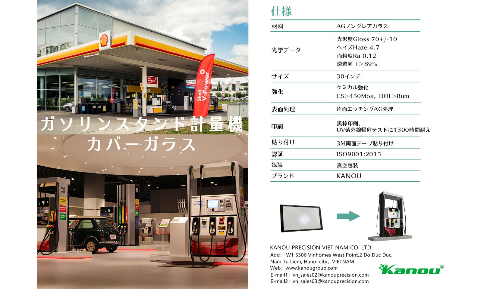 ガラス加工の一貫生産を行っているKANOUは、ベトナム、中国、日本にてAGノングレア処理とUV耐久印刷をご提供致します。