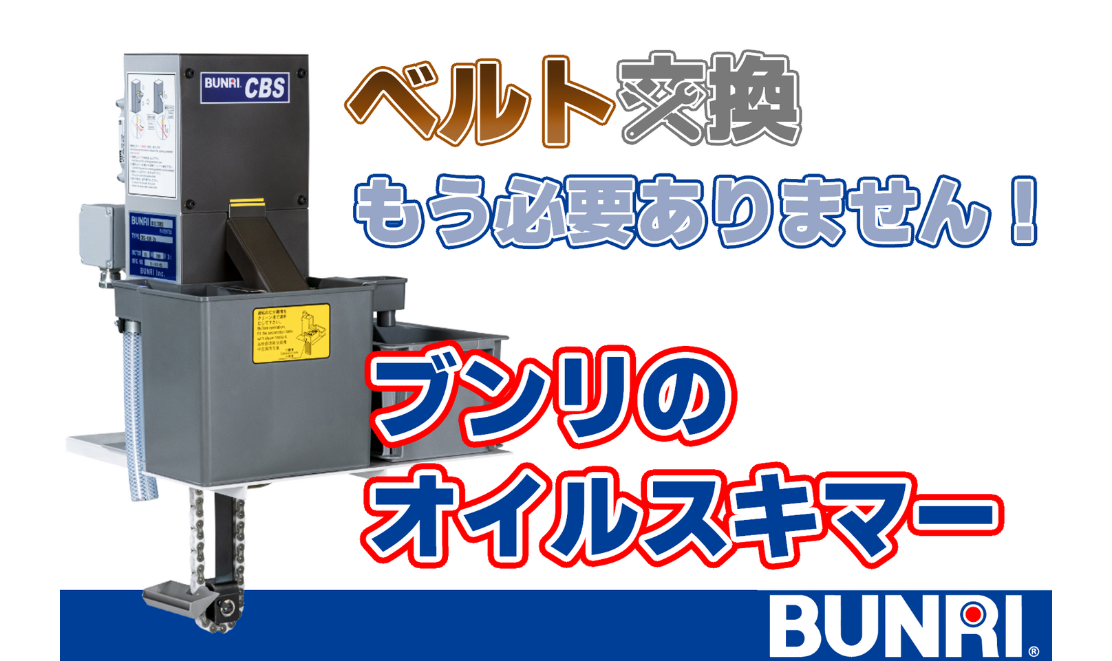 ・チェーンバケットスキマー CBSは、独自のチェーンバケット方式で浮上油やスカムを回収。独自形状のバケットでクーラント液表面の浮上油をすくい取る仕組みです。