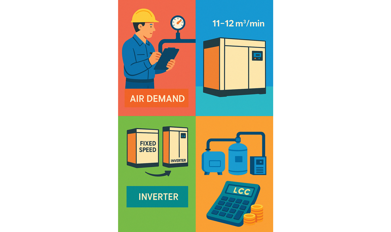 - 変動負荷:注文ベースの生産→インバーターコンプレッサーが最適