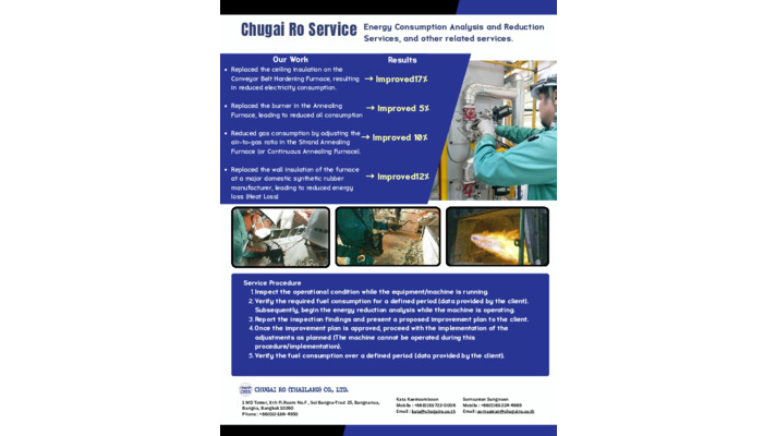 Chugai Ro (Thailand) Co., Ltd.は、長年にわたる基礎技術の蓄積と独自のコア技術を統合し、持続可能な社会に貢献する産業用技術の提供を行っています。自動車部品や機械部品の熱処理炉をはじめ、バッテリー、回路基板、触媒、磁性材料に対応する熱処理炉や、酸素・水素・ガスバーナーなど多彩な燃焼技術を取り揃えています。また、空気浄化装置や塗装ライン、精密コーティング乾燥装置なども提供し、お客様の多様なニーズに応じた最適なソリューションをお届けしています。