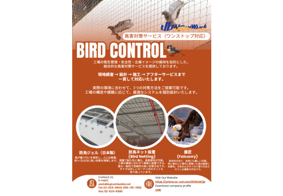 ・鷹匠による鷹での害鳥駆除:工場内・倉庫内などに居着いてしまった害鳥の駆除。特に鳩は帰巣本能が強いため、鷹による害鳥駆除は非常に早い効果が期待できます。美観を損ねない、環境に優しいことから自動車メーカー様、各種自動車部品メーカー様、電子部品メーカー様、食品会社様などを中心に昨今・タイ国内/日本国内でも急速に拡大しつつある対策方法。