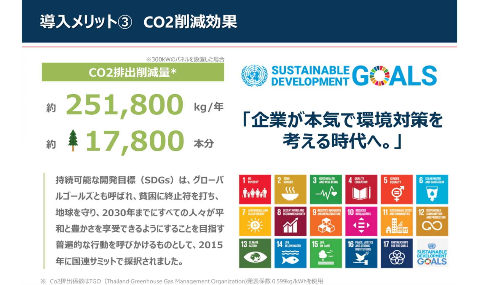 300kWのパネル設置で年間約251,800kgのCO2を削減可能。