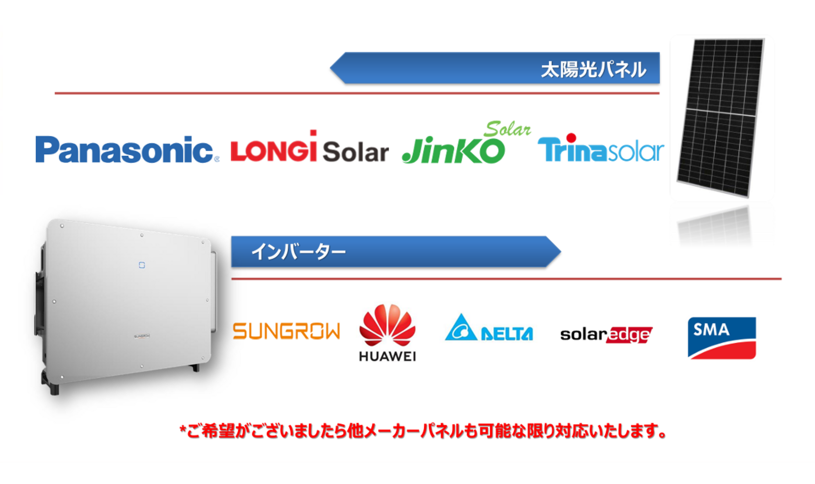 太陽光パネルは、Panasonic、LONGi Solar、Jinko Solar、Trina Solarなどの信頼できるブランドから選択可能です。