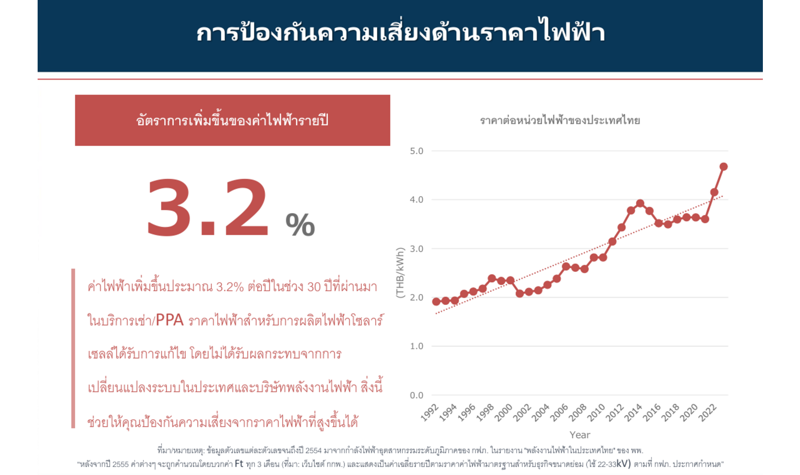 - 1992–2022: ค่าไฟฟ้าเพิ่มเฉลี่ย 3.2% ต่อปี