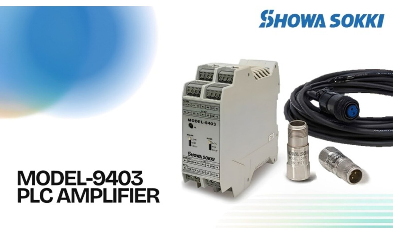 Showa Sokki Model-9403 vibration amplifier with dual DC/AC outputs, PLC integration, and FFT analysis capability.