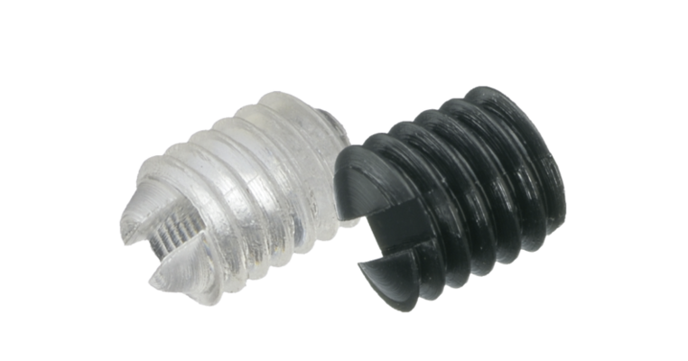 PC/(-)HS は、ポリカーボネート(PC)製の全ねじタイプで、頭部のないマイナス溝付きのイモネジです。透明で軽量、非導電性、耐腐食性を兼ね備えており、限られたスペースや見た目が重要な電子機器や医療機器、精密機器に最適です。