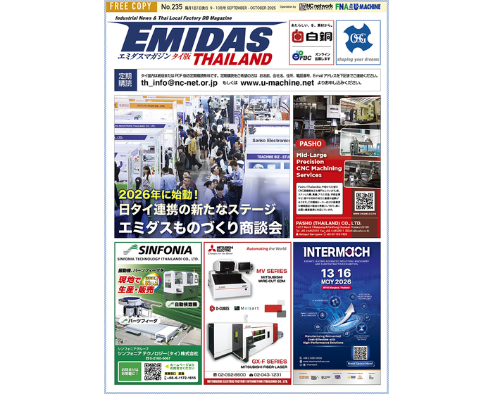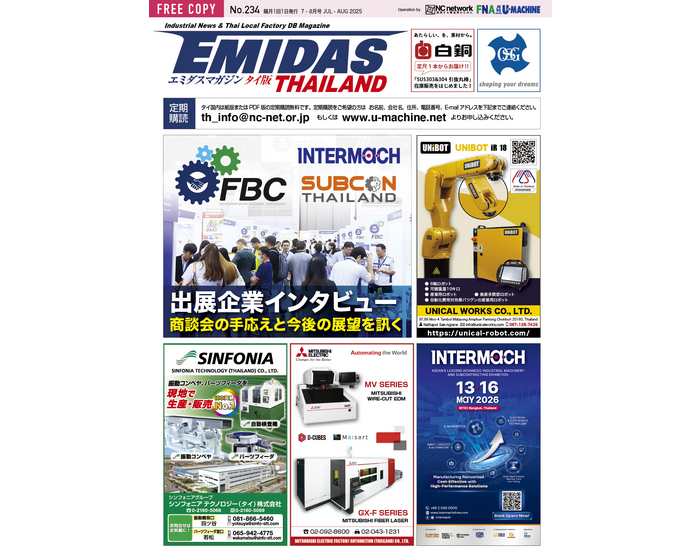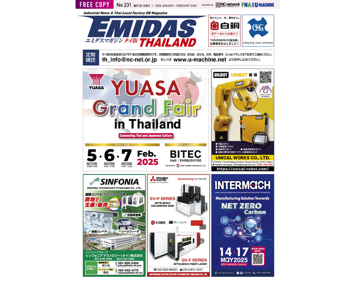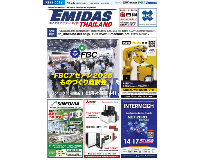 6) Coming Soon in Bangkok! Introducing All Exhibiting Companies!! FBC ASEAN 2025 Manufacturing Business Meeting 【Special Interview】 8) Informa Markets Thailand × NC Network Asia Conversations with Key Figures Driving Thailand’s Manufacturing Industry The Future Opened by INTERMACH and Expectations for Japanese Companies 【Exhibitor Interviews】 18) YS TECH (THAILAND) CO., LTD. Expanding Opportunities with OEMs and Tier-1s at FBC Business Meeting Strengthening Supply of Exhaust & Machined Parts for HEVs 20) Opening the Door to the ASEAN Market with EMIDAS Challenges of NC Network’s Sales Manager 28) NEWS TOPICS from Nikkei Thai Business Daily 29) BOI (Thailand Board of Investment) Approved Projects 30) Insights from Data Analysis by Segment: Thailand’s Auto Industry [Automobiles] 31) AUTO TOPICS from Nikkei Thai Business Daily 33) EMIDAS Member Company Introductions 40) Used Machinery Introduction 【Serial Columns】 19) Customer Voices – Vol. 4: NABELIN (THAILAND) CO., LTD. 22) Trends of Thai Companies – What is Happening Now? by Shinichi Kobori Vol. 89: The Latest Developments in the Expansion of Chinese EVs into Thailand 32) Useful Thai for Business Vol. 90: Complaint Handling (Part 9) 38) Toward a New Era of Thai Railways – The Railroads that Built the Kingdom’s Prosperity by Shinichi Kobori Vol. 113: Concept of the Indochina–Malay Peninsula Transcontinental Railway / China–Laos Railway 4