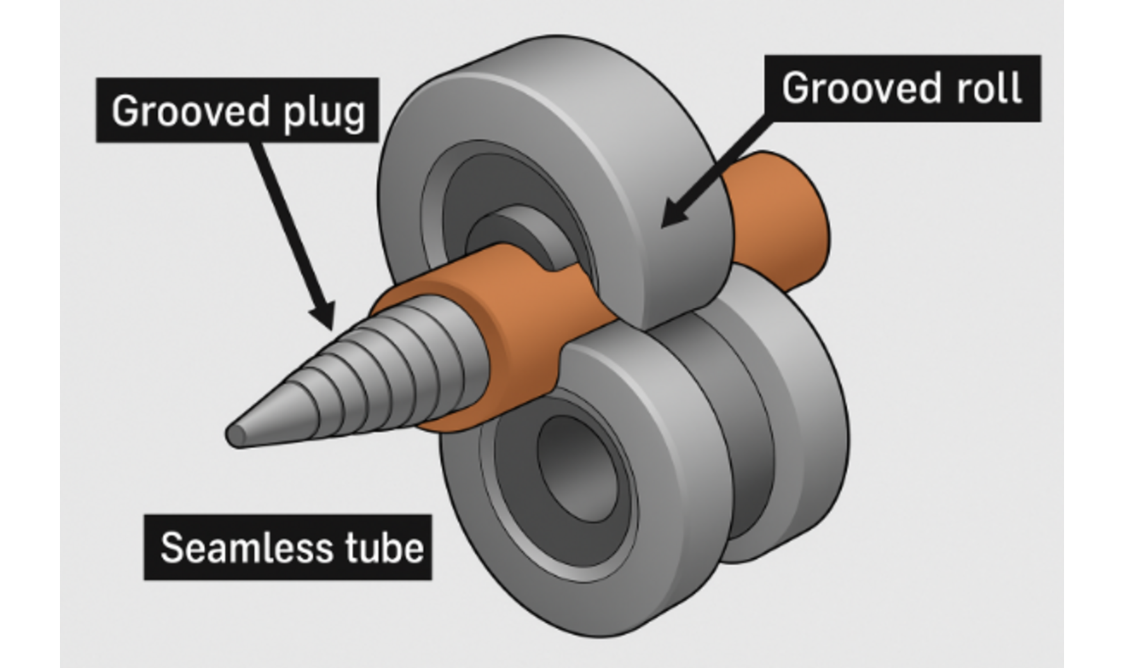 管圧延(Tube Rolling)は、シームレス管製造における重要な工程です。外側からのグルーブロールの圧力と、内側からのグルーブプラグによる抵抗を利用して、寸法、厚み、真円度を制御します。