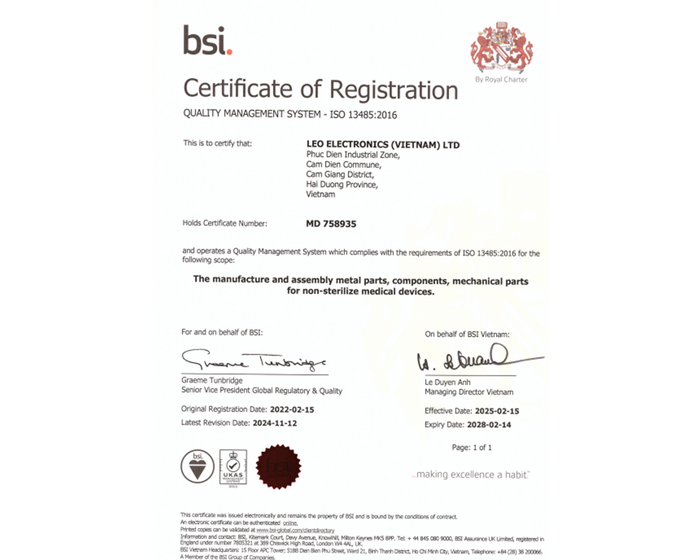 Our company is officially registered with Japan’s Ministry of Health, Labour and Welfare (MHLW) as a foreign medical device manufacturer and has obtained ISO13485 (BSI) certification. At our factory in Hai Phong, Viet Nam, we offer a fully integrated production system- from sheet metal processing, welding and surface treatment to assembly and quality inspection We strictly comply with traceability and quality control requirements in the medical industry, enabling us to reliably process components and assemble medical device frames and housings Key Features: - Officially registered as a foreign medical device manufacturer meeting Japanese standards - Certified with ISO13485 (BSI), compliant with medical device quality management systems - Dedicated production line exclusively for medical devices: from sheet metal processing – welding – assembly - Burr-free processing achieved through automated deburring equipment immediately after sheet cutting - Resident Japanese experts perform on-site inspections and evaluations according to medical equipment standards Equipment & Production Capabilities: - Materials: Stainless steel (SUS304, SUS430), aluminum, copper, steel - Sheet Metal Processing: Fiber laser, combined punch & laser machine, press brake, automatic deburring machine - Welding: TIG welding, spot welding, robotic welding - Assembly: From component assembly and wiring to electrical testing and operational checks - Quality Control: 3D measurement, coating thickness inspection, visual inspection, and traceability management of parts Representative Medical Applications: - Frames and components for medical analysis equipment - Metal housings and parts for suction, washing, and diagnostic devices - Devices such as control panels and power supply units for healthcare facilities LEO ELECTRONICS Vietnam specializes in precision metal processing and complete assembly. We offer global supply capabilities for the medical device industry, certified to ISO13485 and compliant with Japanese standards. Please download our PDF brochure or contact us for more details.