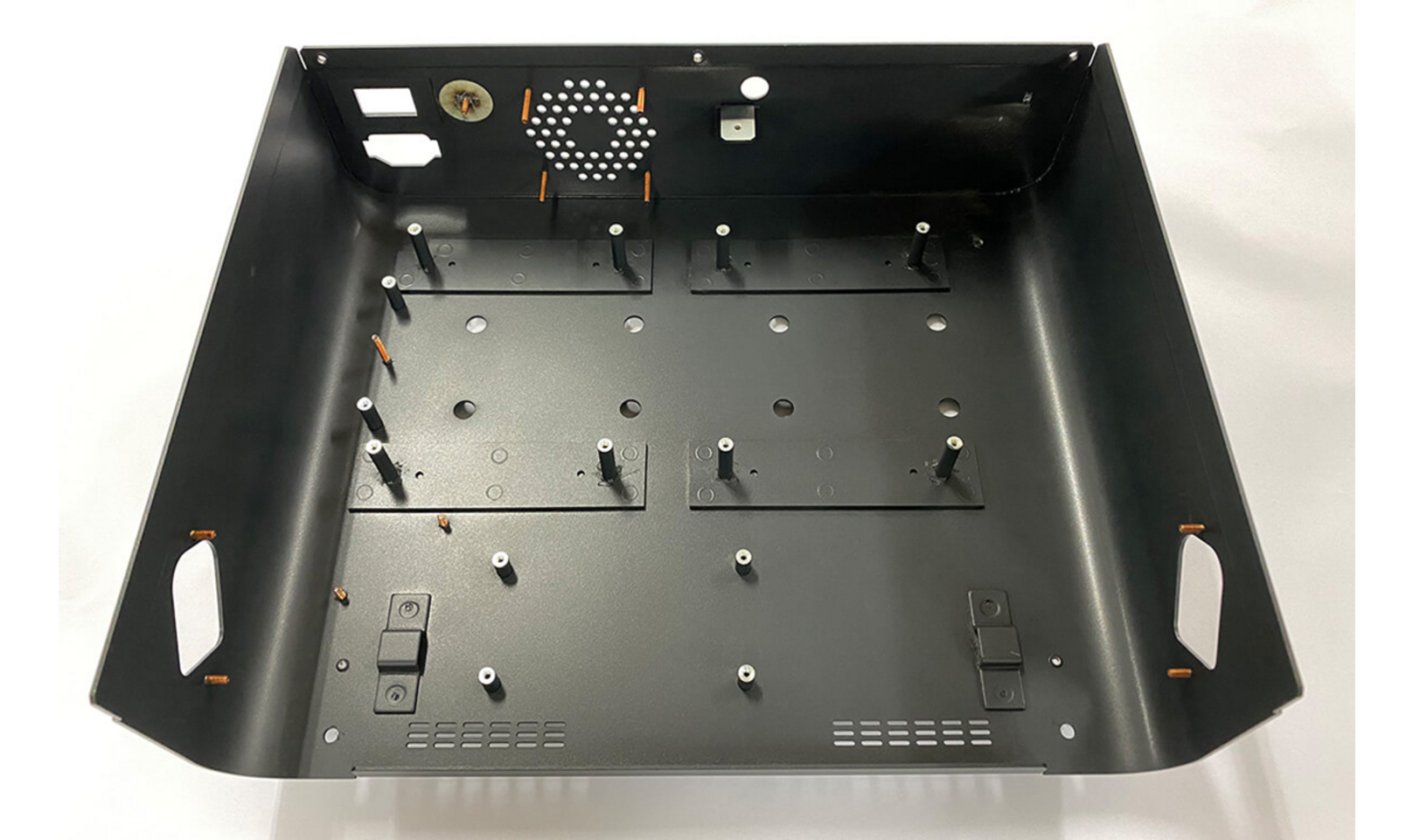 画像のような筐体部品は、レーザー切断やタレットパンチでの複雑な穴加工、複数方向の曲げ加工、多数のタップ穴の精密位置加工、スタッド溶接による部品取り付けといった多工程を組み合わせる必要があります。これらを社内で完結し、塗装など外注加工についても日本基準での品質管理を行うことで、現地調達でも安心できる製品供給を実現しています。