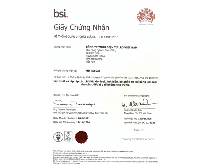 Công ty chúng tôi đã được đăng ký chính thức với Bộ Y tế, Lao động và Phúc lợi Nhật Bản (MHLW) với tư cách là nhà sản xuất thiết bị y tế nước ngoài, đồng thời đạt được chứng nhận ISO13485 (BSI). Tại nhà máy đặt tại tỉnh Hải Phòng, Việt Nam, chúng tôi có năng lực sản xuất khép kín từ gia công kim loại tấm, hàn, xử lý bề mặt, lắp ráp đến kiểm tra chất lượng. Chúng tôi đáp ứng nghiêm ngặt các yêu cầu về truy xuất nguồn gốc và kiểm soát chất lượng trong ngành y tế, từ đó thực hiện gia công linh kiện và lắp ráp khung vỏ thiết bị y tế với độ tin cậy cao. Đặc điểm nổi bật: - Đã đăng ký tư cách nhà sản xuất thiết bị y tế nước ngoài đạt tiêu chuẩn Nhật Bản - Hệ thống quản lý chất lượng đáp ứng tiêu chuẩn thiết bị y tế với chứng nhận ISO13485 (BSI) - Dây chuyền sản xuất chuyên biệt dành riêng cho thiết bị y tế: từ gia công kim loại – hàn – lắp ráp - Gia công không còn ba via với thiết bị tự động xử lý ba via ngay sau cắt tấm - Chuyên gia người Nhật thường trú, trực tiếp thực hiện kiểm tra và đánh giá chất lượng theo tiêu chuẩn thiết bị y tế Năng lực thiết bị và sản xuất: - Vật liệu: Inox (SUS304, SUS430), nhôm, đồng, thép - Gia công kim loại tấm: Laser fiber, máy tổ hợp đột dập & laser, máy chấn, máy cắt ba via tự động - Gia công hàn: Hàn TIG, hàn điểm, hàn robot - Lắp ráp: Từ lắp cụm thiết bị, đi dây điện đến kiểm tra điện và kiểm tra vận hành - Quản lý chất lượng: Đo 3D, kiểm tra độ dày lớp phủ, kiểm tra ngoại quan và quản lý truy xuất linh kiện Ứng dụng sản phẩm tiêu biểu trong ngành y tế: - Khung vỏ và linh kiện cho thiết bị phân tích y tế - Khung vỏ kim loại và linh kiện cho thiết bị hút, rửa, chẩn đoán - Thiết bị như bảng điều khiển, cụm cấp điện cho cơ sở y tế LEO ELECTRONICS Vietnam là doanh nghiệp chuyên gia công kim loại chính xác và lắp ráp hoàn chỉnh, có năng lực cung ứng toàn cầu trong lĩnh vực thiết bị y tế, đạt chứng nhận ISO13485 và đáp ứng tiêu chuẩn Nhật Bản. ■ Vui lòng tải tài liệu PDF hoặc liên hệ với chúng tôi để biết thêm chi tiết.