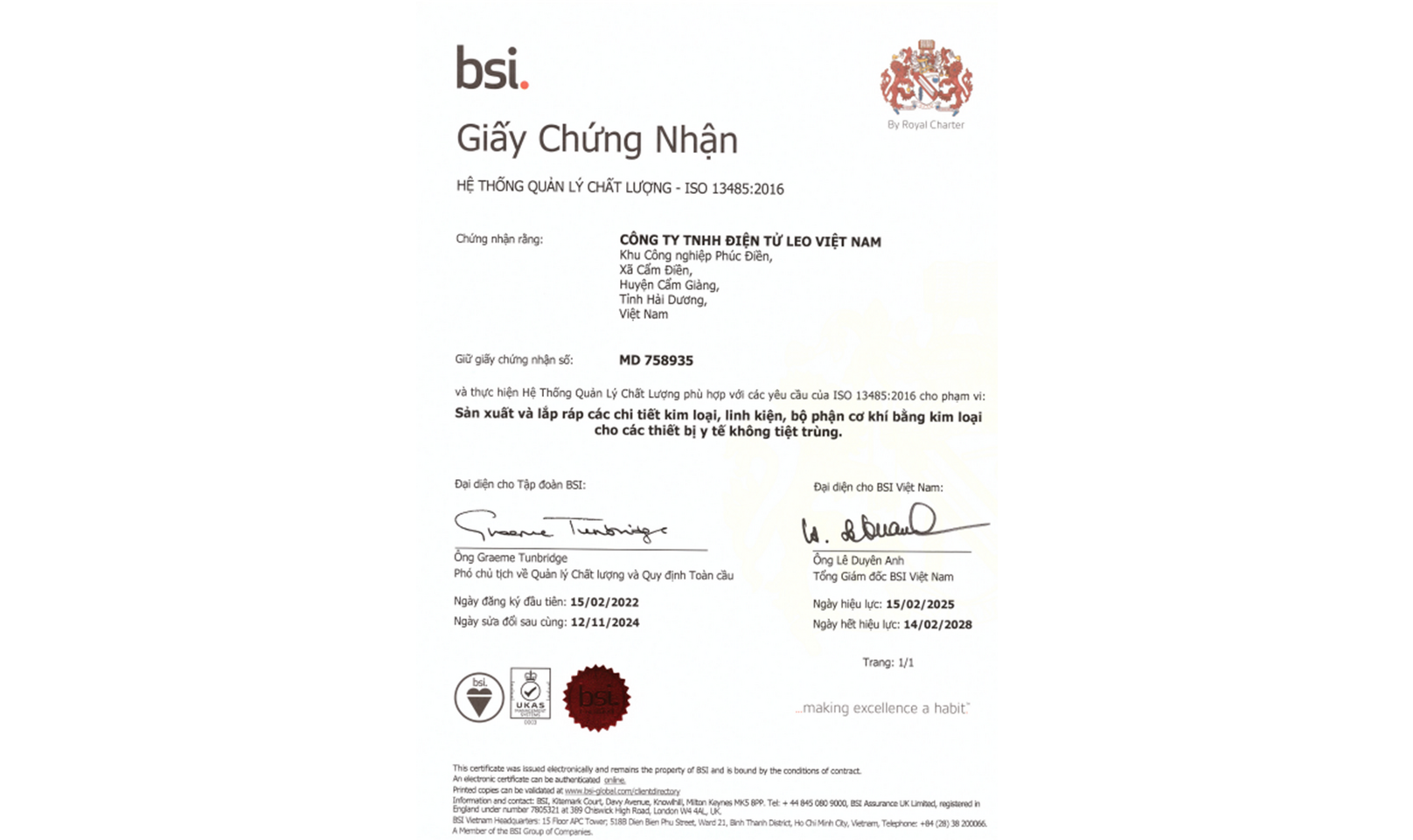 LEO ELECTRONICS Vietnam là doanh nghiệp chuyên gia công kim loại chính xác và lắp ráp hoàn chỉnh, có năng lực cung ứng toàn cầu trong lĩnh vực thiết bị y tế, đạt chứng nhận ISO13485 và đáp ứng tiêu chuẩn Nhật Bản.