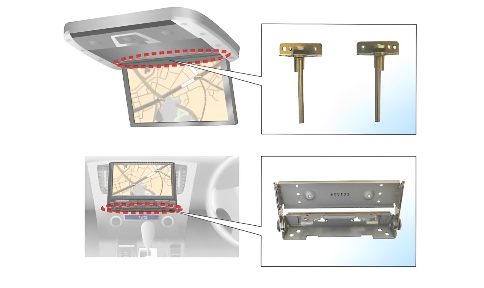 บานพับนี้ใช้ในระบบจอมอนิเตอร์ในรถยนต์ เช่น จอกลางแดชบอร์ดหรือจอบริเวณเบาะหลัง ซึ่งต้องการความแข็งแรงและความเสถียรสูงในการเปิด-ปิด เพิ่มความสวยงามและฟังก์ชันให้กับห้องโดยสาร