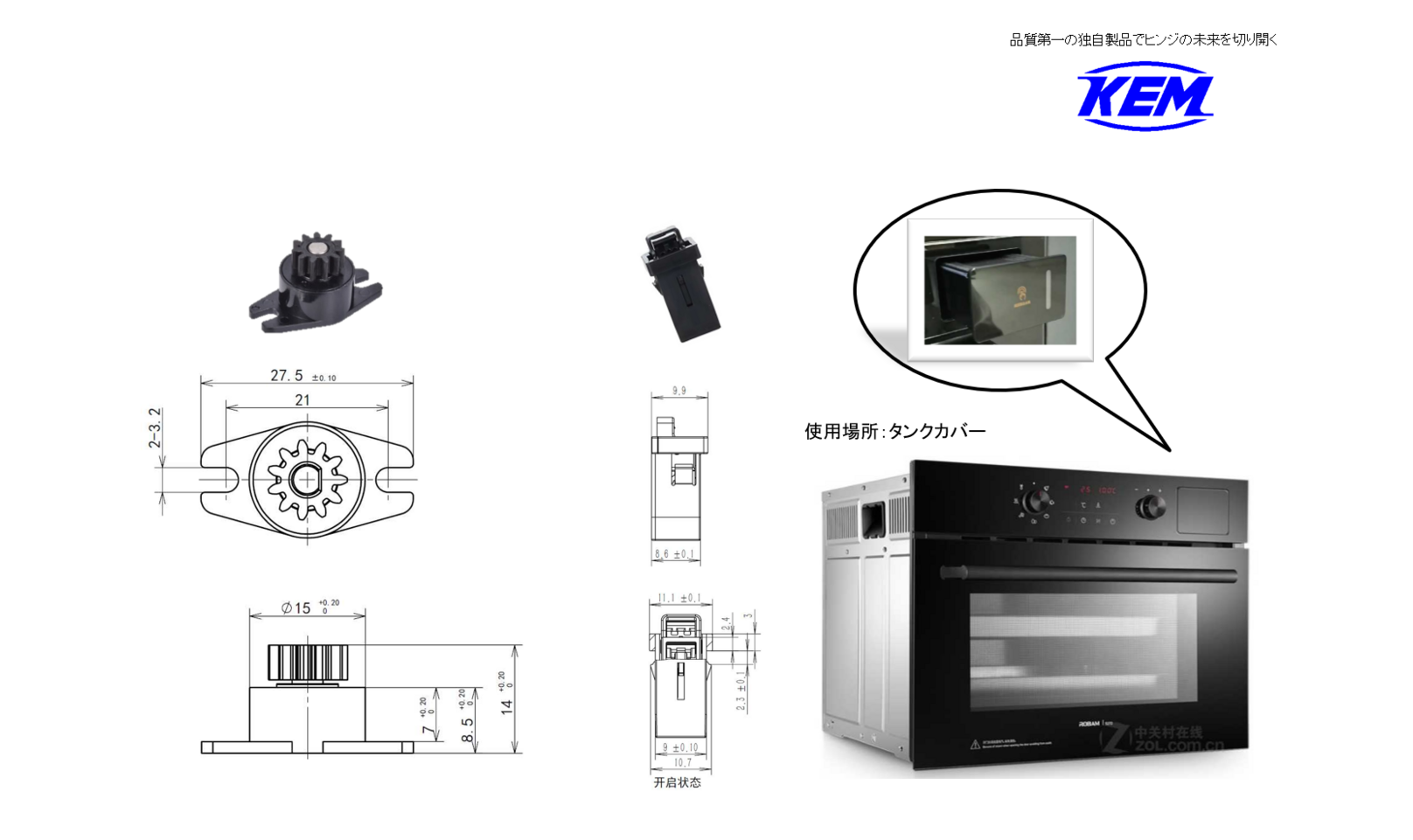 ข้อมูลที่อ้างอิง: Rotary Damper (Gear Type), มิติ 27.5 × 15 × 14 mm, ภาพตัวอย่างการติดตั้งกับประตูเตาอบ